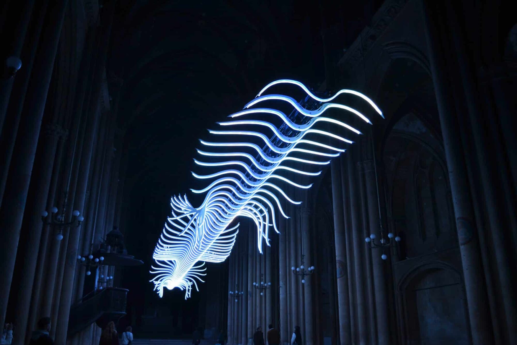 On retrouve ce contraste entre œuvre et lieu à travers les deux séquences du mapping vidéo de la cathédrale, mais il est particulièrement frappant dans le cas de la Basilique Saint-Vincent, désacralisée en 2012. La suspension dans la nef de l’édifice d’Un oiseau de passage du duo Luminariste (Benjamin Nesme & Marc Sicard), sculpture lumineuse monumentale décomposant le vol d’un oiseau, est un défi technique rendu possible par la détermination de l’équipe du festival. “En tant qu’architecte, je suis habitué à travailler avec les contraintes pour créer un projet à partir de celles-ci. Ce sont [elles] qui façonnent mes idées, notamment sur le parcours” précise Jérémie Bellot. Le résultat est à la hauteur des attentes : l’œuvre s’intègre parfaitement dans la Basilique, elle paraît flotter dans la nef où résonne les battements d’ailes et de délicats ramages. Le duo n’en est pas à son coup d’essai, le projet faisant écho à leur précédent projet L’envol, présent sur le parcours diurne depuis trois ans.